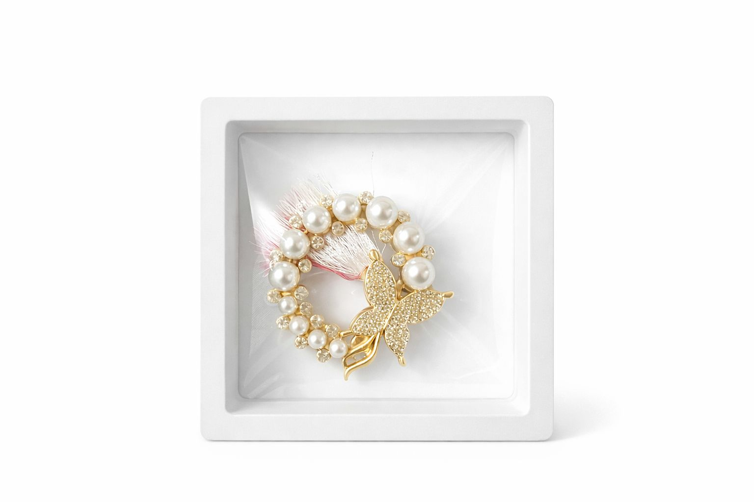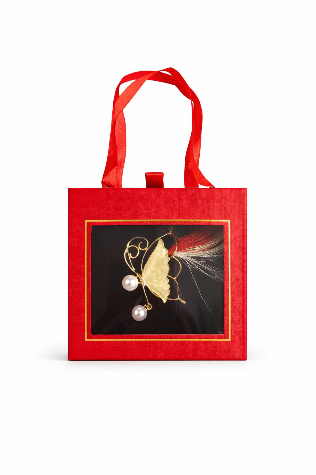 Brosa Martisor 5cm, Fluture cu perle, in cutie gentuta 7x7 cm cu fereastra, cadou 1 Martie