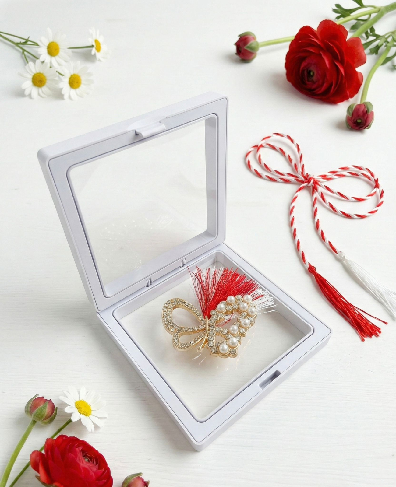 Brosa Martisor 5 cm, Fluture cu cristale si perle, in cutie 9x9 cm cu fereastra, cadou 1 Martie