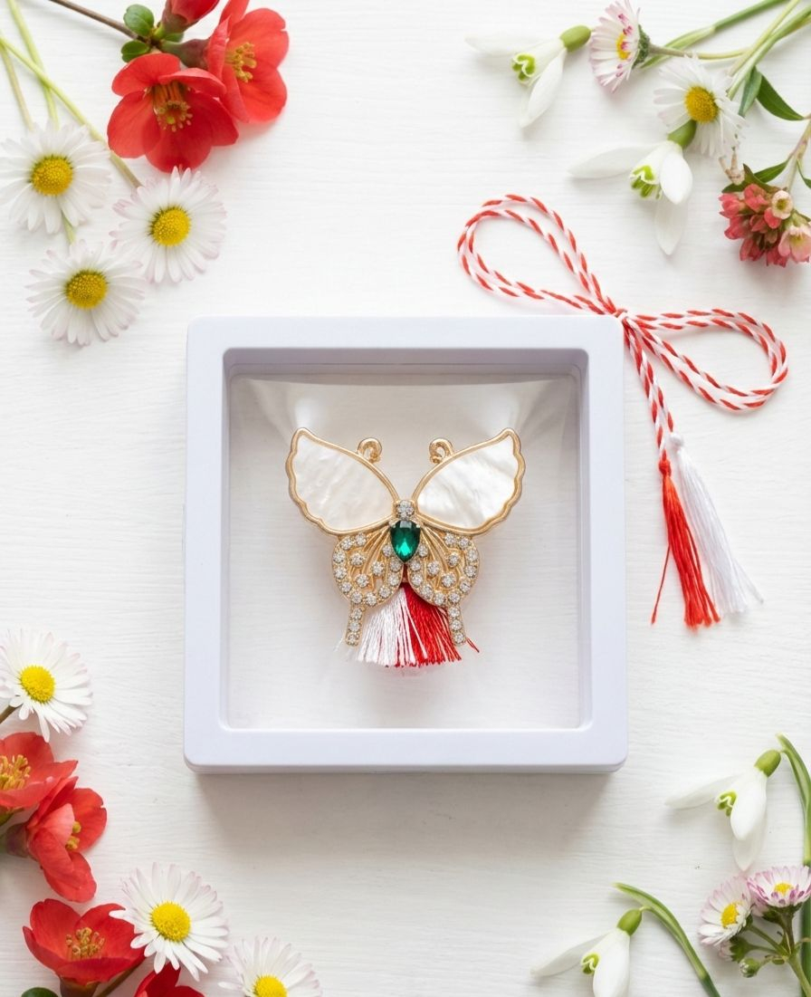 Brosa Fluture Martisor cu Pietre Multicolore si Snur Alb-Rosu si Cutie Catifea