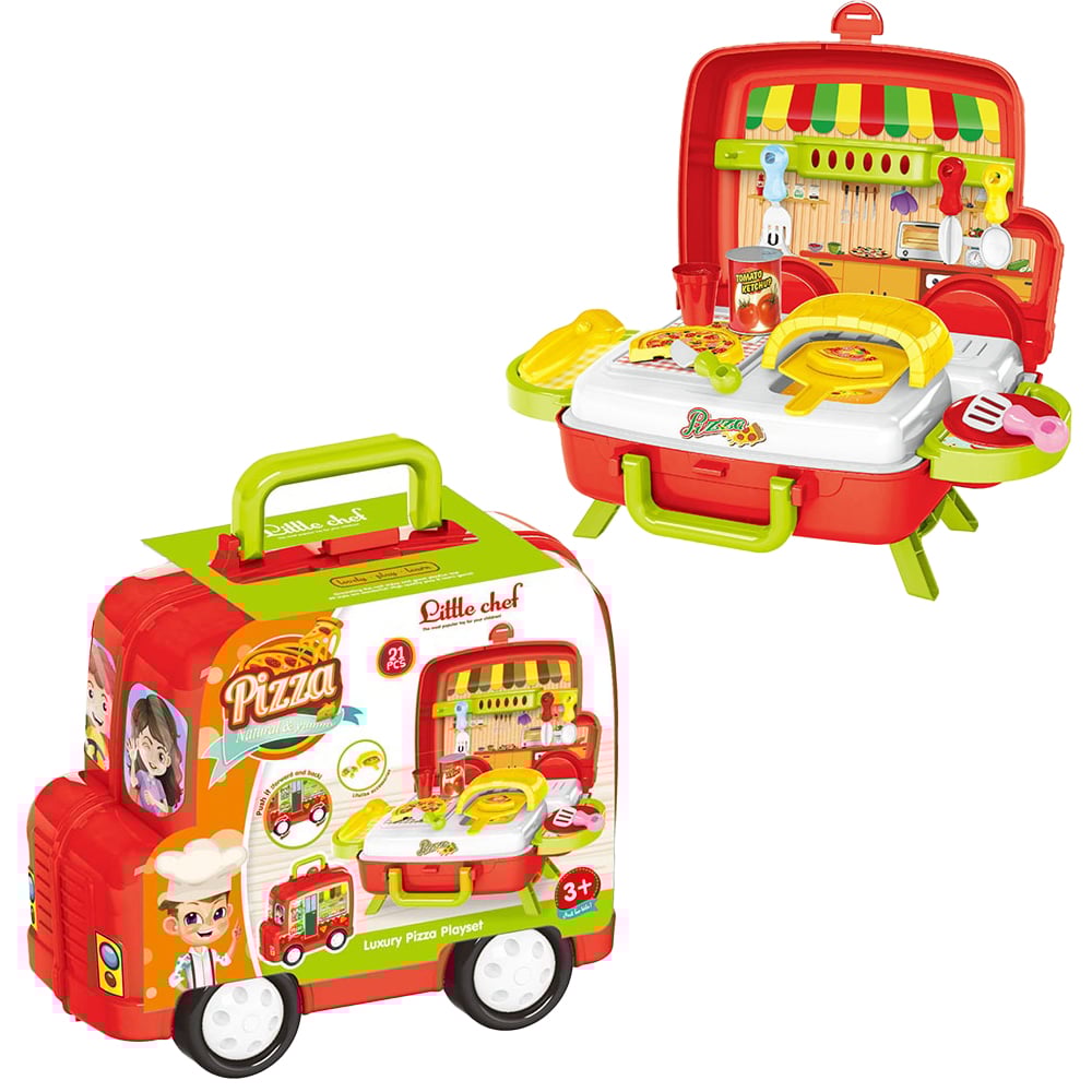 Set bucatarie de jucarie Engros, educationala, interactiva cu accesorii, cu depozitare sau portabila in gentuta, forma de masinuta, microbus fast food cu pizza si cuptor, 21 piese, Pitikot®
