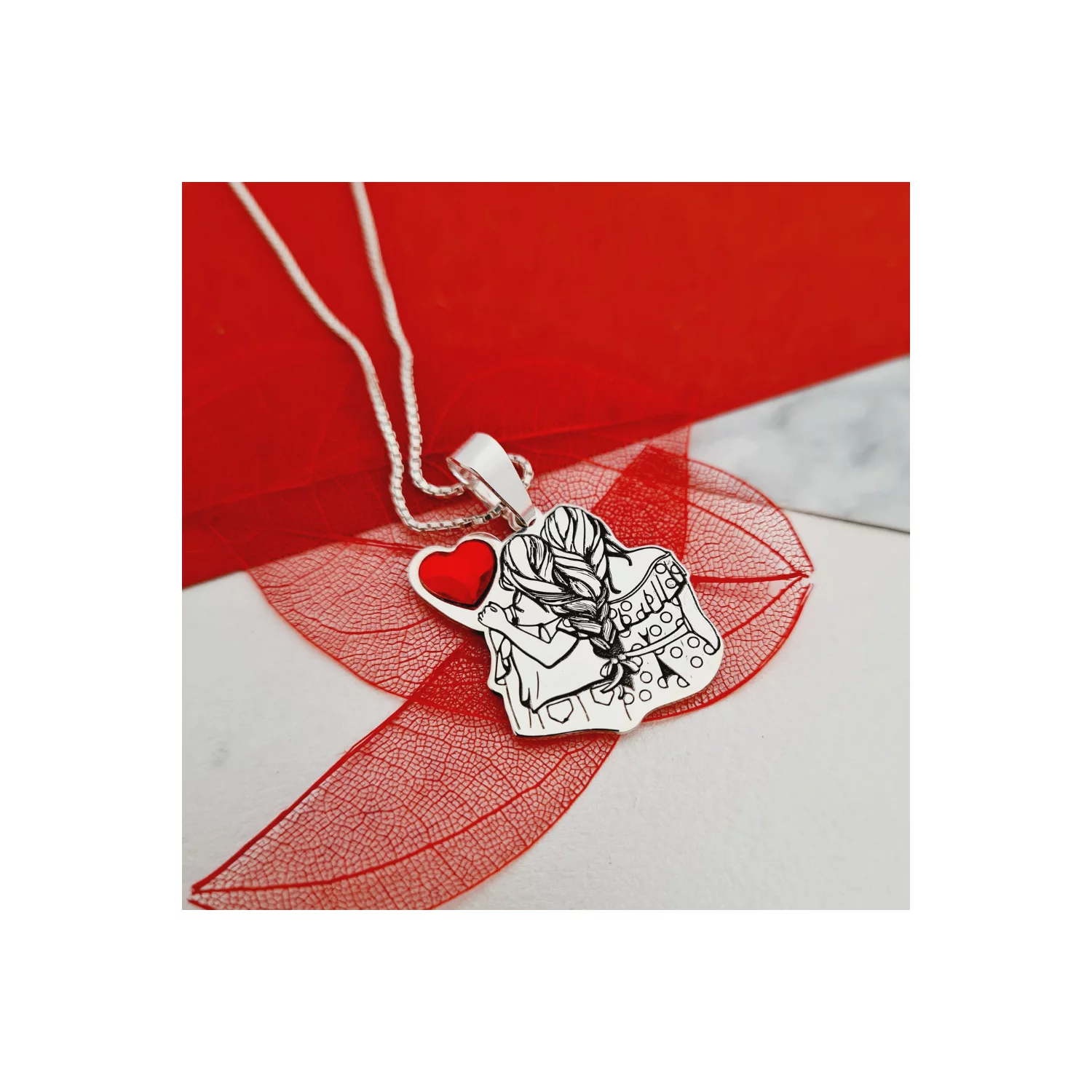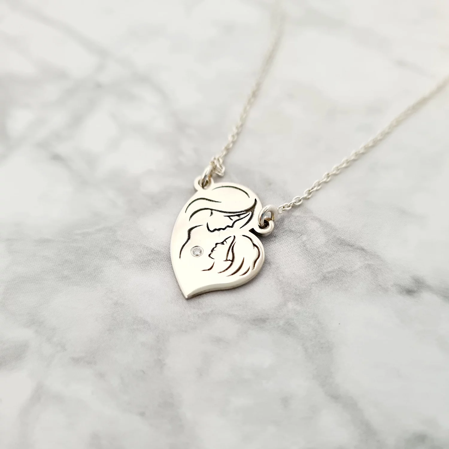 Lantisor personalizat - Siluete mama si fiica - Argint 925 - inima cristal Swarovski