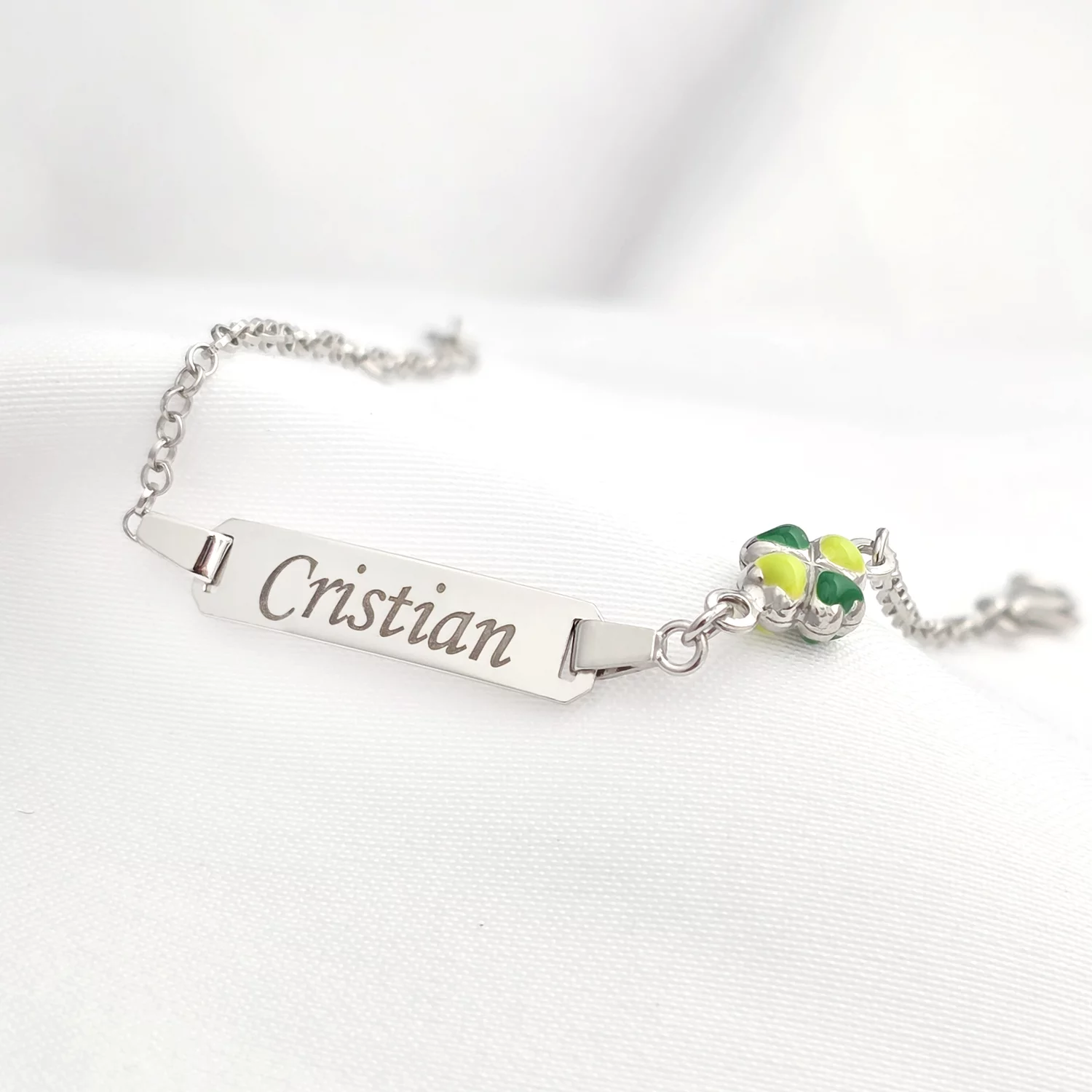 Bratara bebe - Placuta cu nume - Trifoi colorat si lantisor - Argint 925 Rodiat