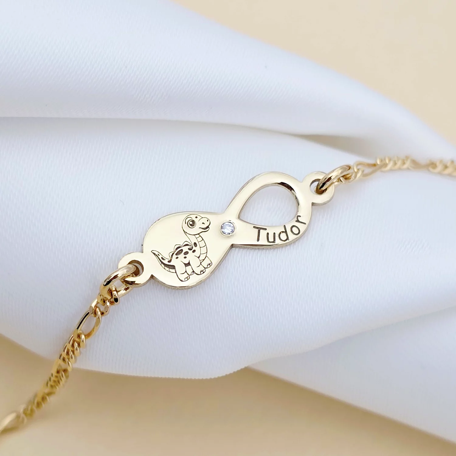 Brățară personalizata cu simbolul infinitului,dinozaur și nume – Diamant natural - Argint 925 placat cu Aur Galben 18K - Cu lantisor fata/baiat