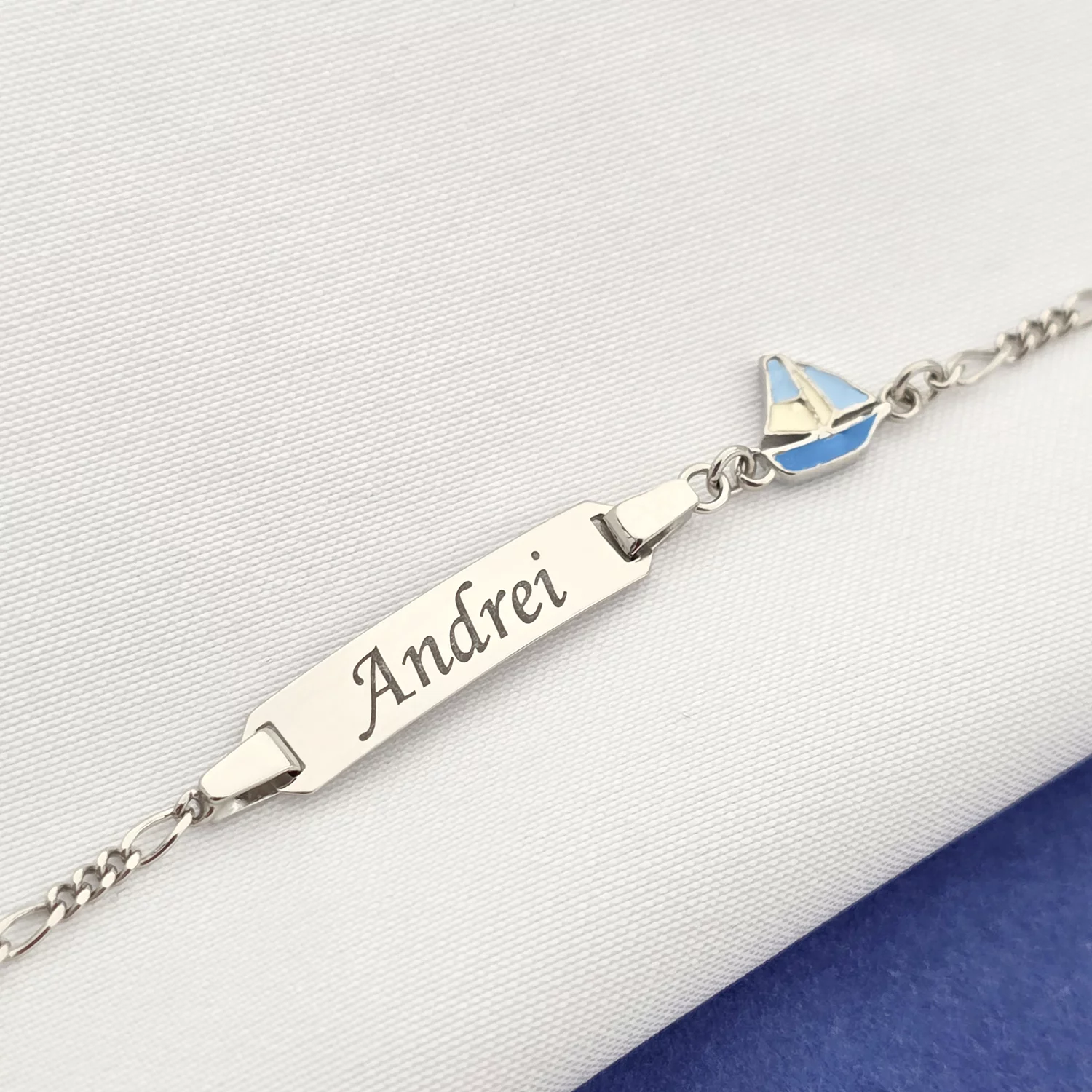 Bratara bebe - Placuta cu nume - Simbol barcuta colorata si lantisor - Argint 925