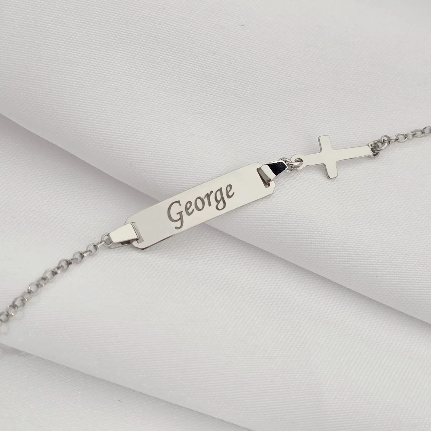 Bratara bebe - Placuta cu nume - Simbol cruciulita si lantisor - Argint 925 Rodiat