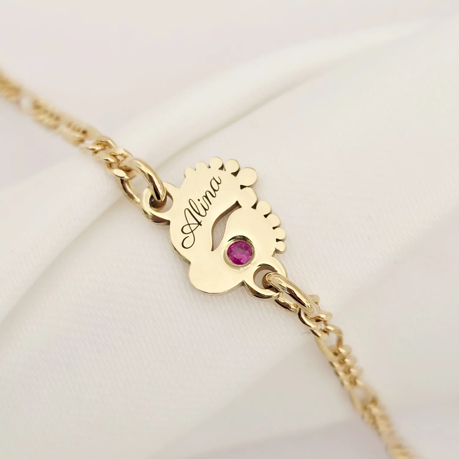 Bratara picioruse - personalizate cu nume si Piatra pretioasa - Argint 925 placat cu Aur Galben 18K - Cu lantisor fata/baiat