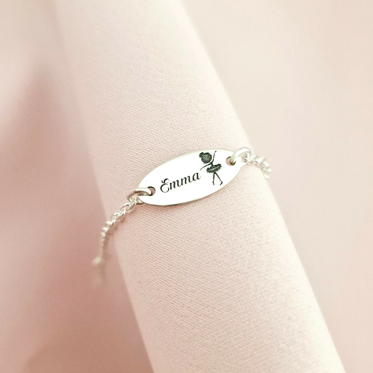 Bratara oval simbol balerina - Nume personalizat - Argint 925 - Cu lantisor fata/baiat