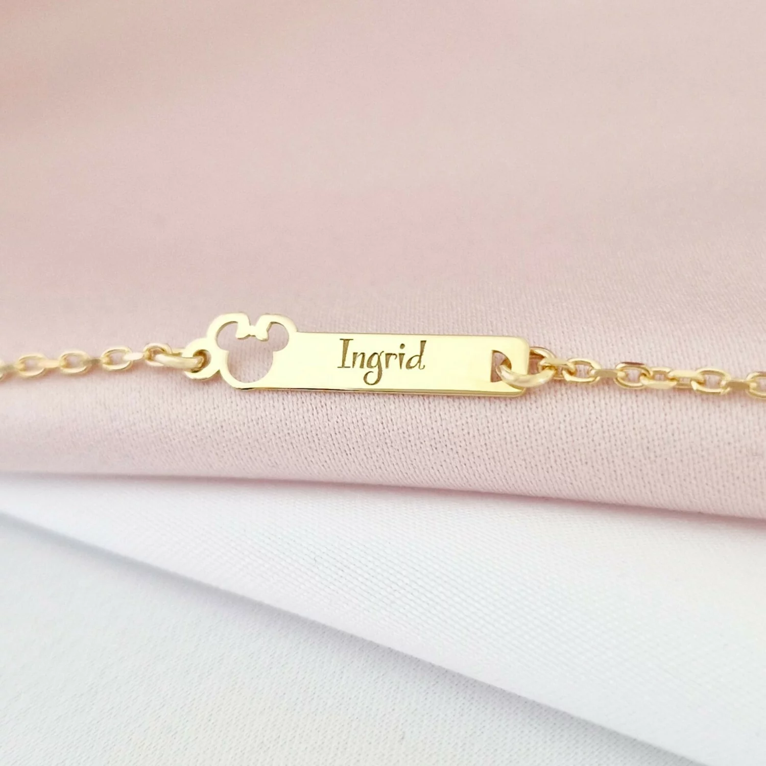 Bratara placuta - Forma soricel gravat cu nume personalizat - Argint 925 placat cu Aur Galben 18K - Cu lantisor fata/baiat