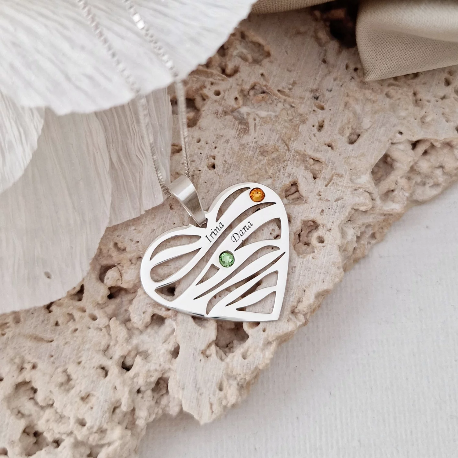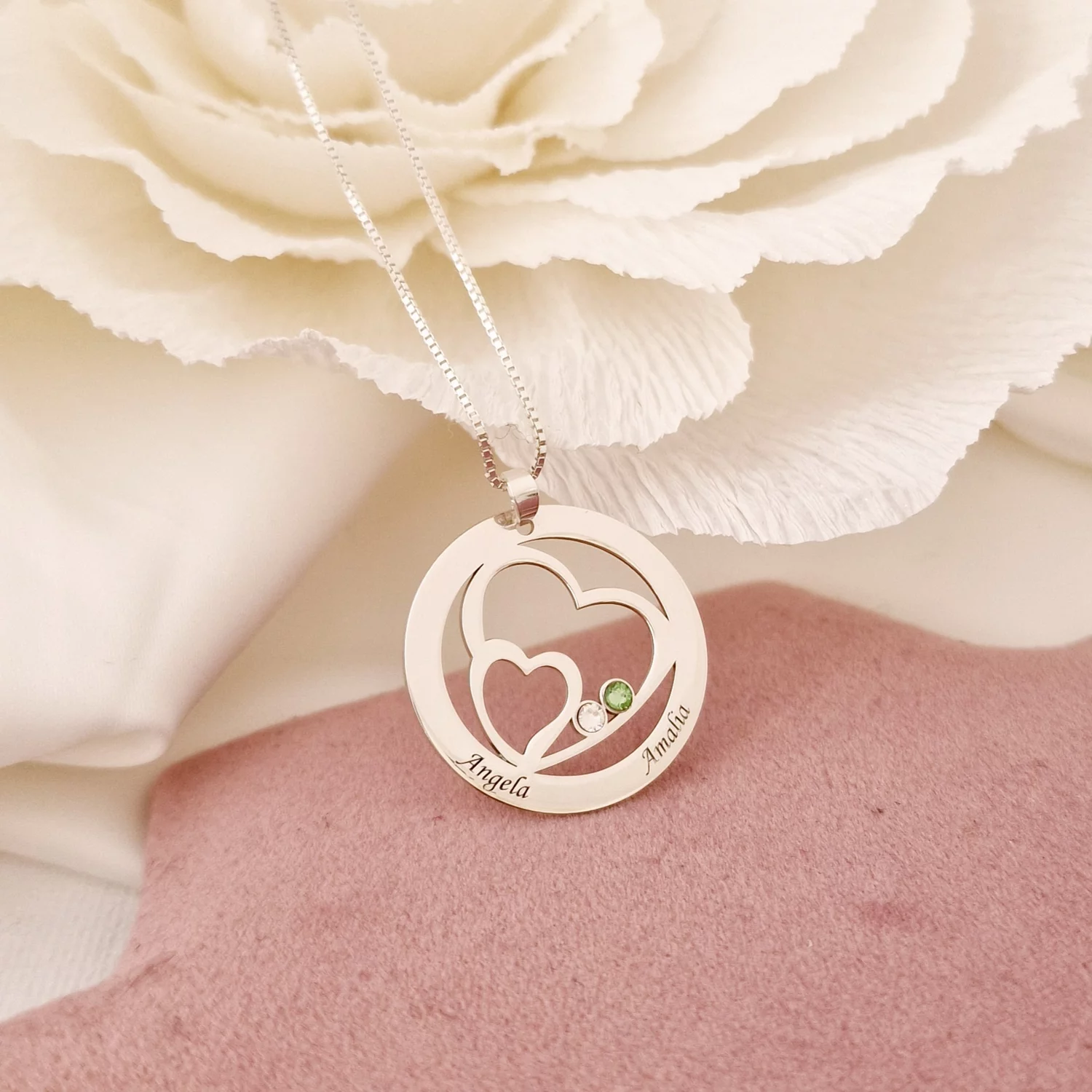 Lantisor Familie unita - Inimi in disc - 2 nume si cristale Swarovski - Argint 925