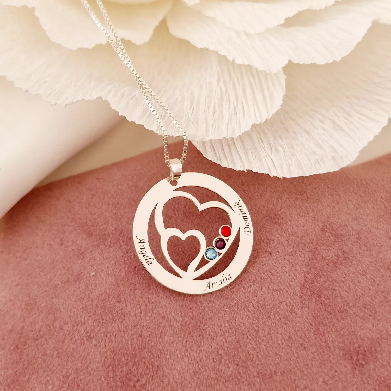 Lantisor Familie unita - Inimi in disc - 3 nume si cristale Swarovski - Argint 925