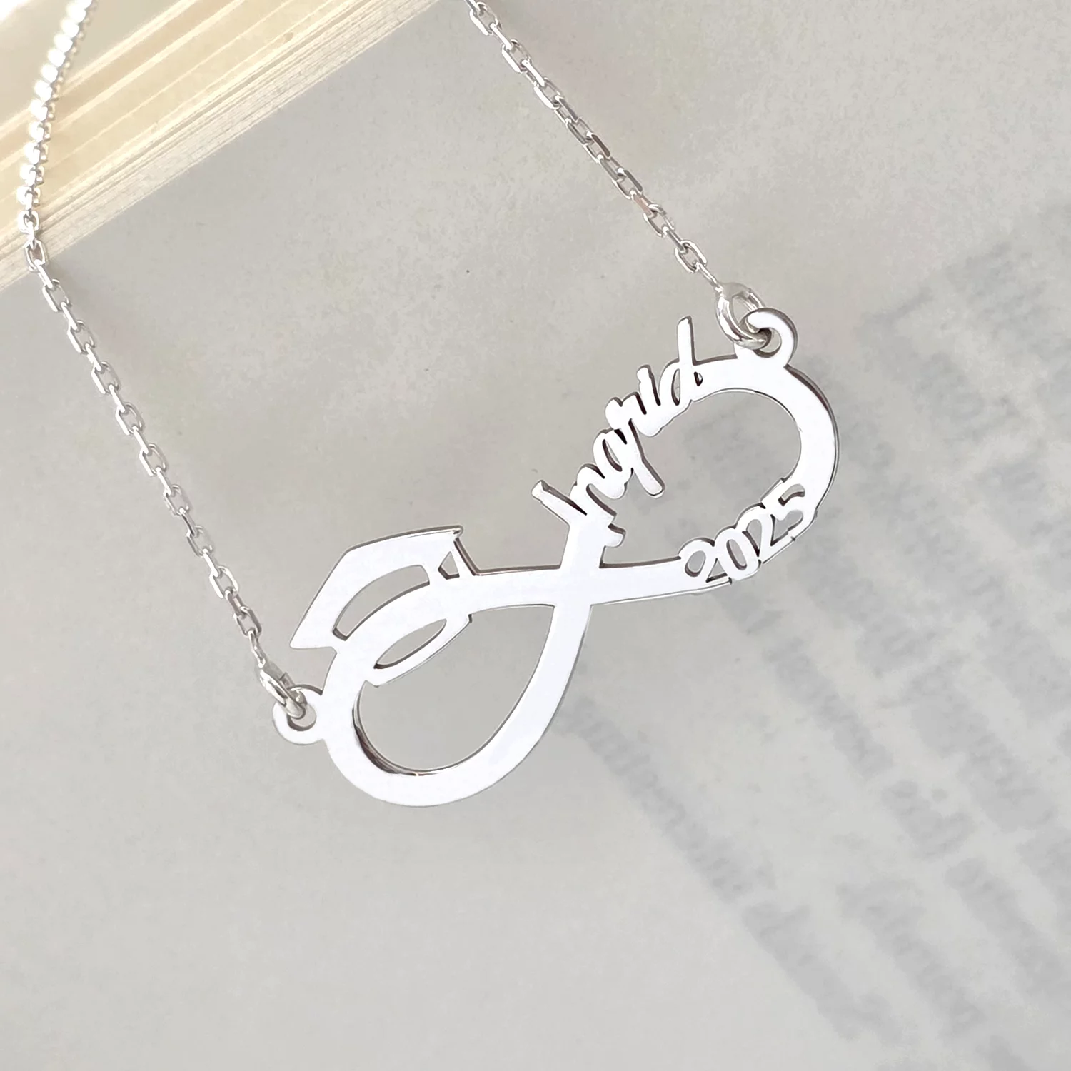 Lantisor personalizat - Medalion Infinit cu Nume Decupat și Toca – Simbol al Absolvirii - Argint 925