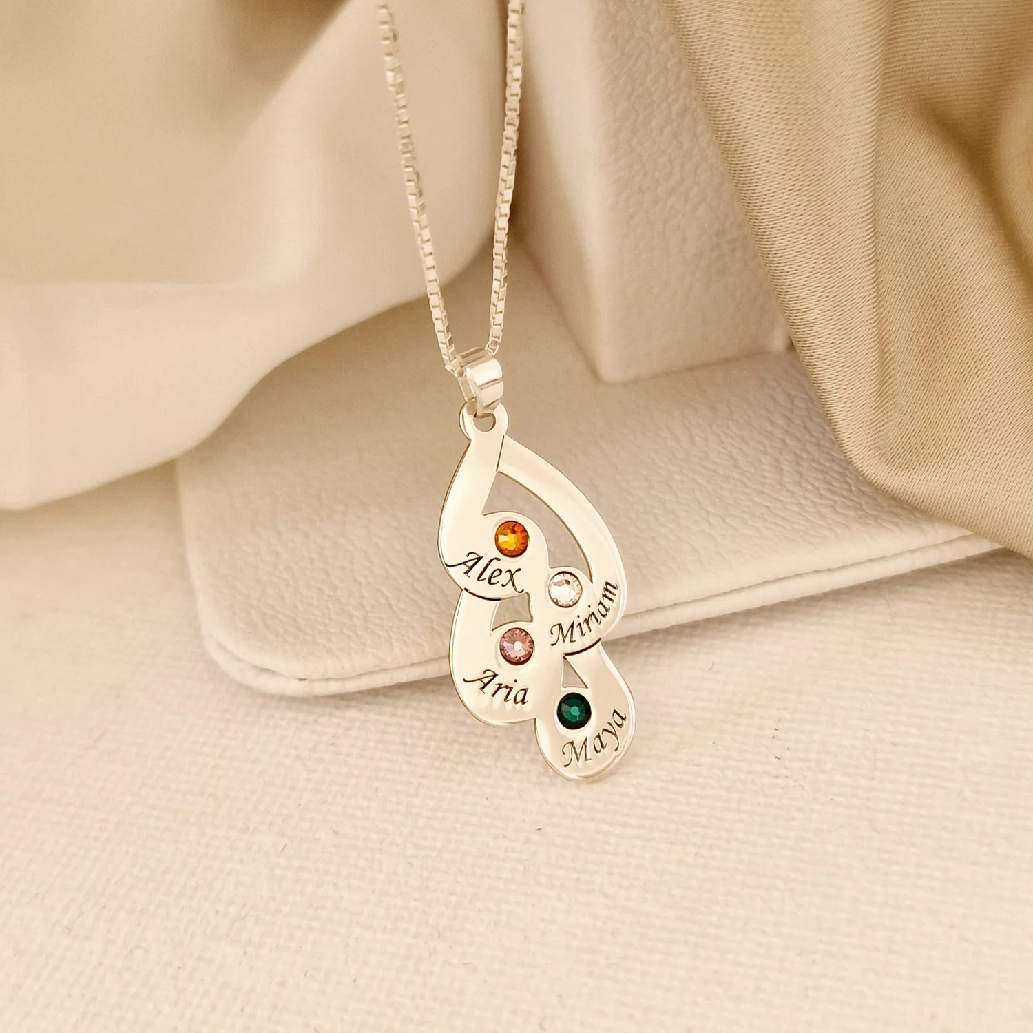 Lantisor Familie unita - Inimi in disc - 4 nume si cristale Swarovski - Argint 925