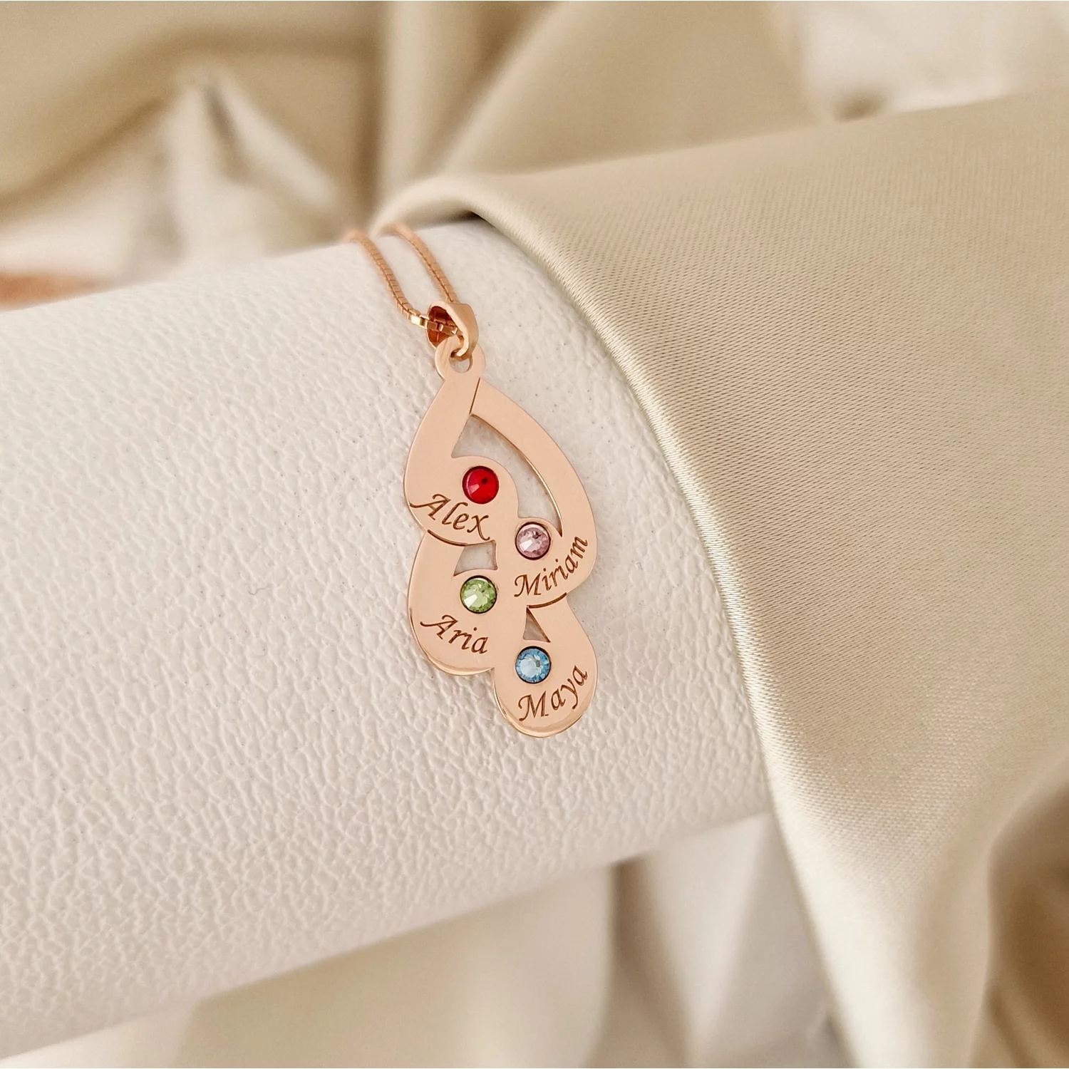 Lantisor Familie unita - Inimi in disc - 4 nume si cristale Swarovski - Argint 925 placat cu Aur Roz 18K