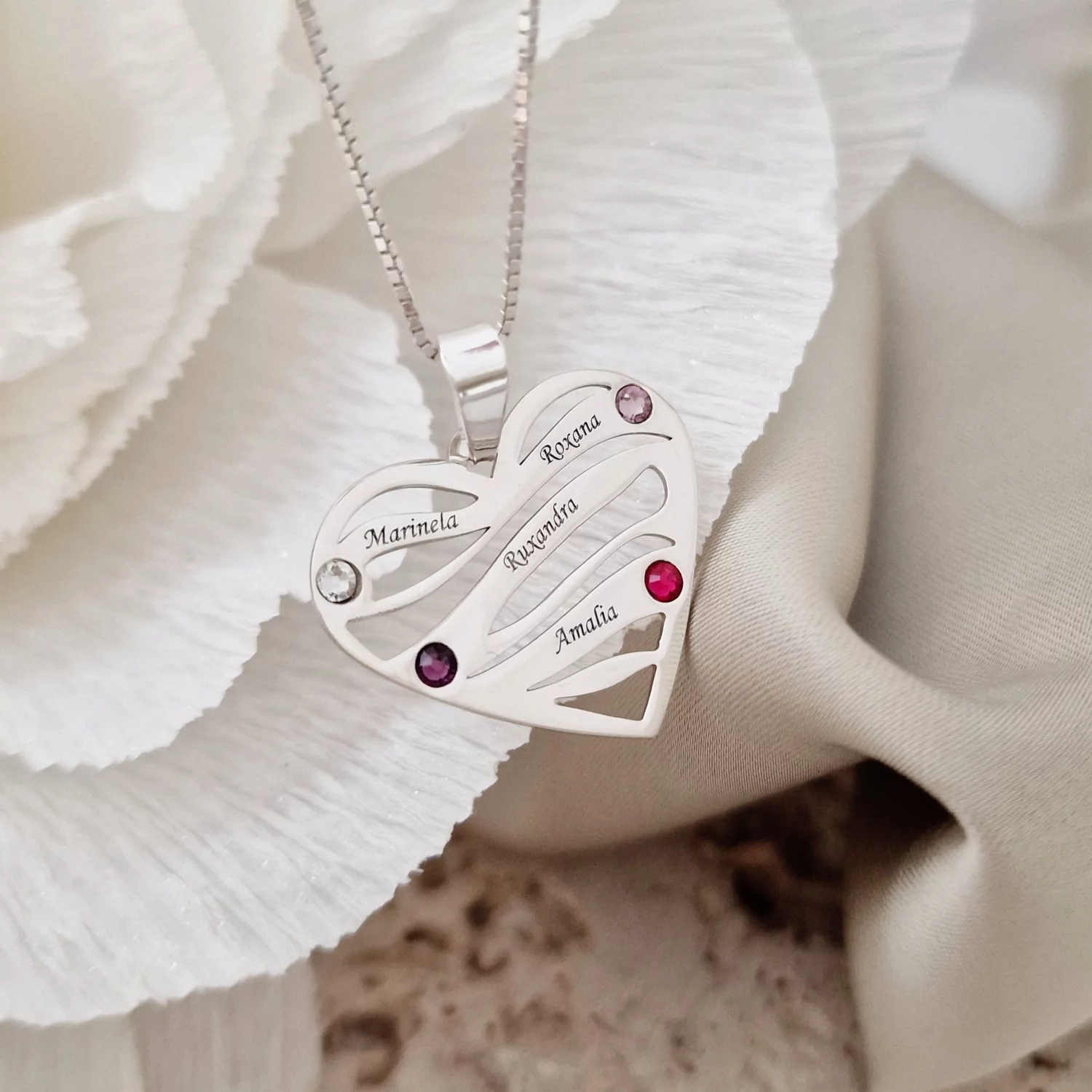 Lantisor Familie unita - Inimi in disc - 7 nume si cristale Swarovski - Argint 925