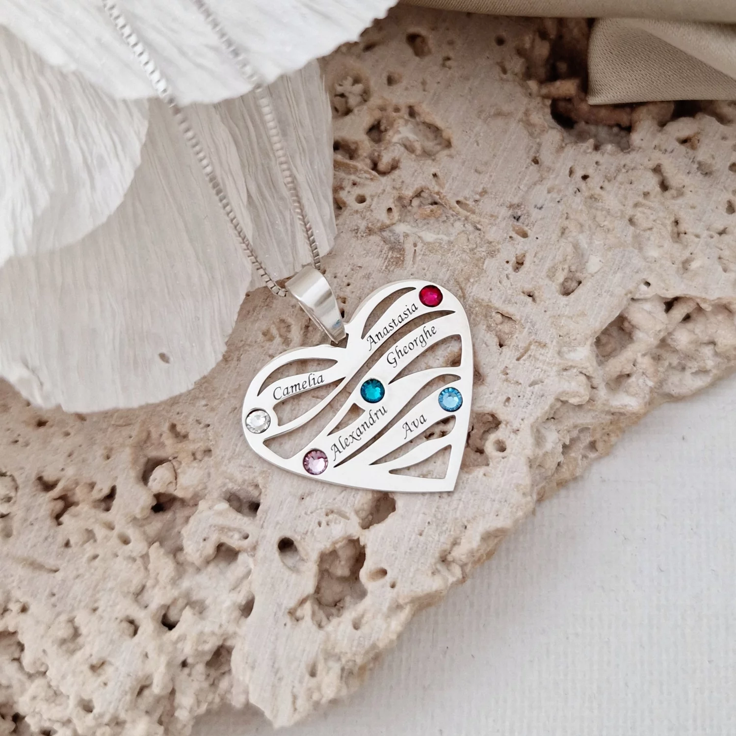 Lantisor Familie unita - Inimi in disc - 6 nume si cristale Swarovski - Argint 925