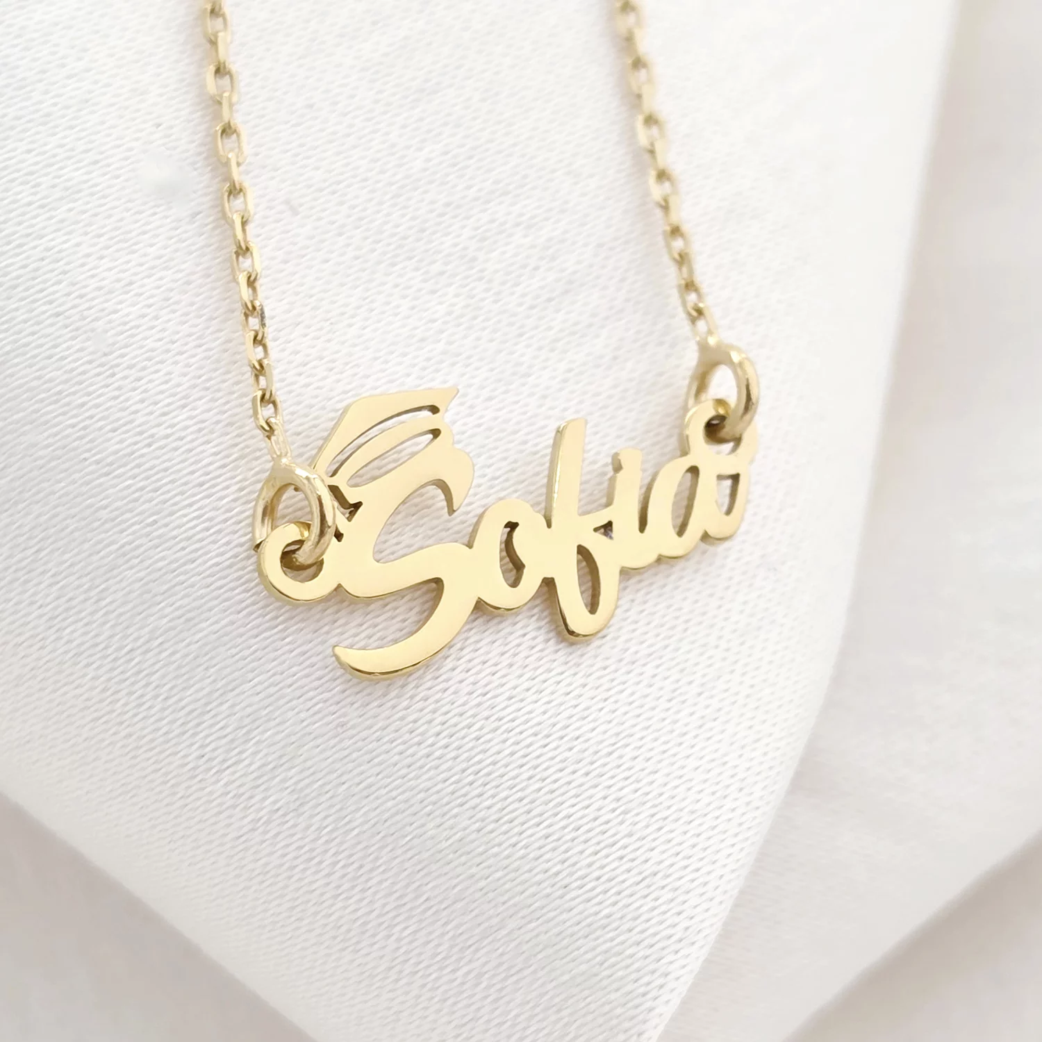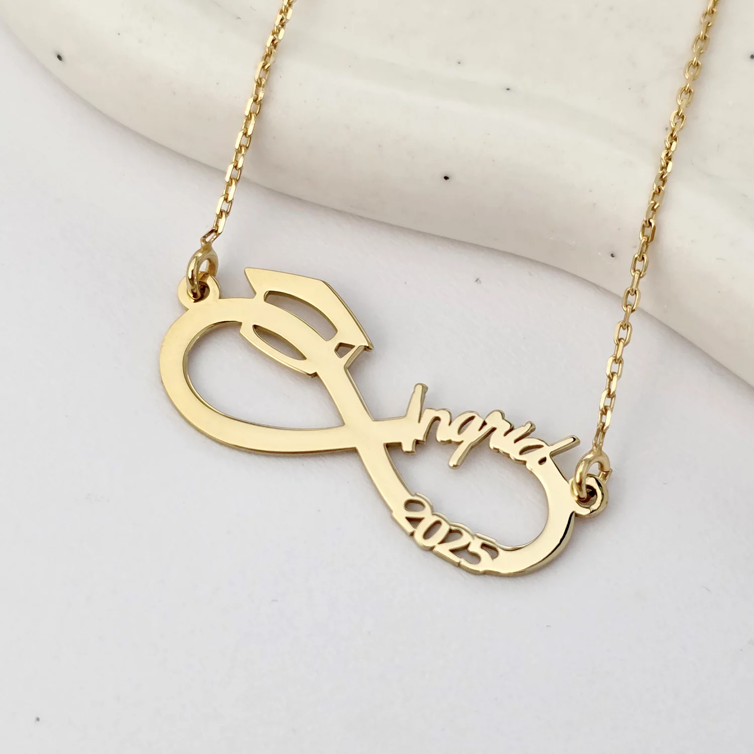 Lantisor personalizat - Medalion Infinit cu Nume Decupat și Toca – Simbol al Absolvirii - Argint 925 placat cu Aur Galben 18K