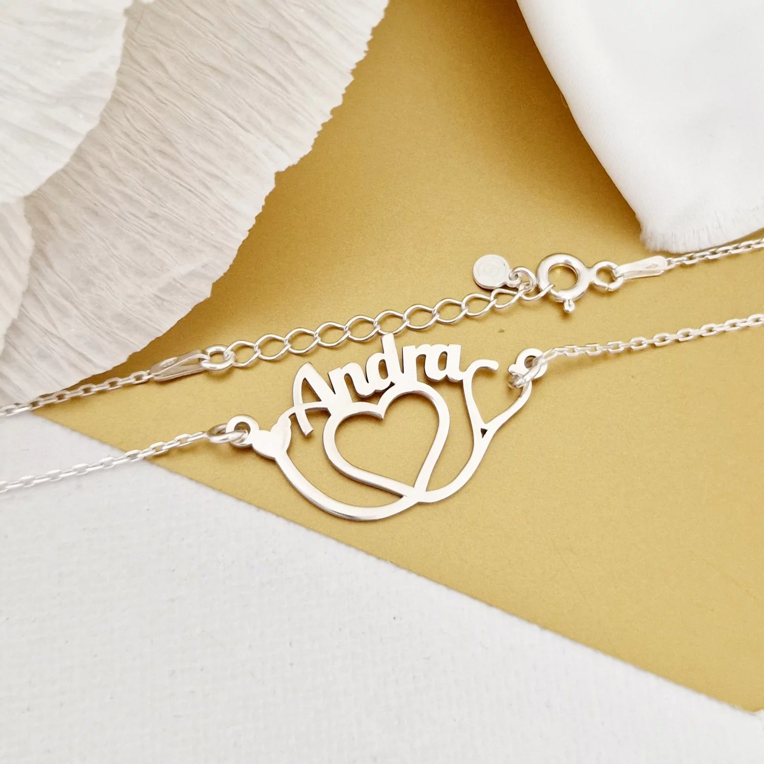 Lantisor personalizat cu nume si simbol inima - Font elegant - Argint 925