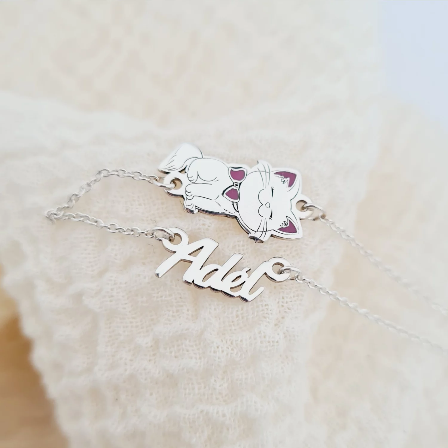 Lantisor personalizat cu Nume si pandantiv lateral Pisicuta cu fundita colorata cu email - Argint 925