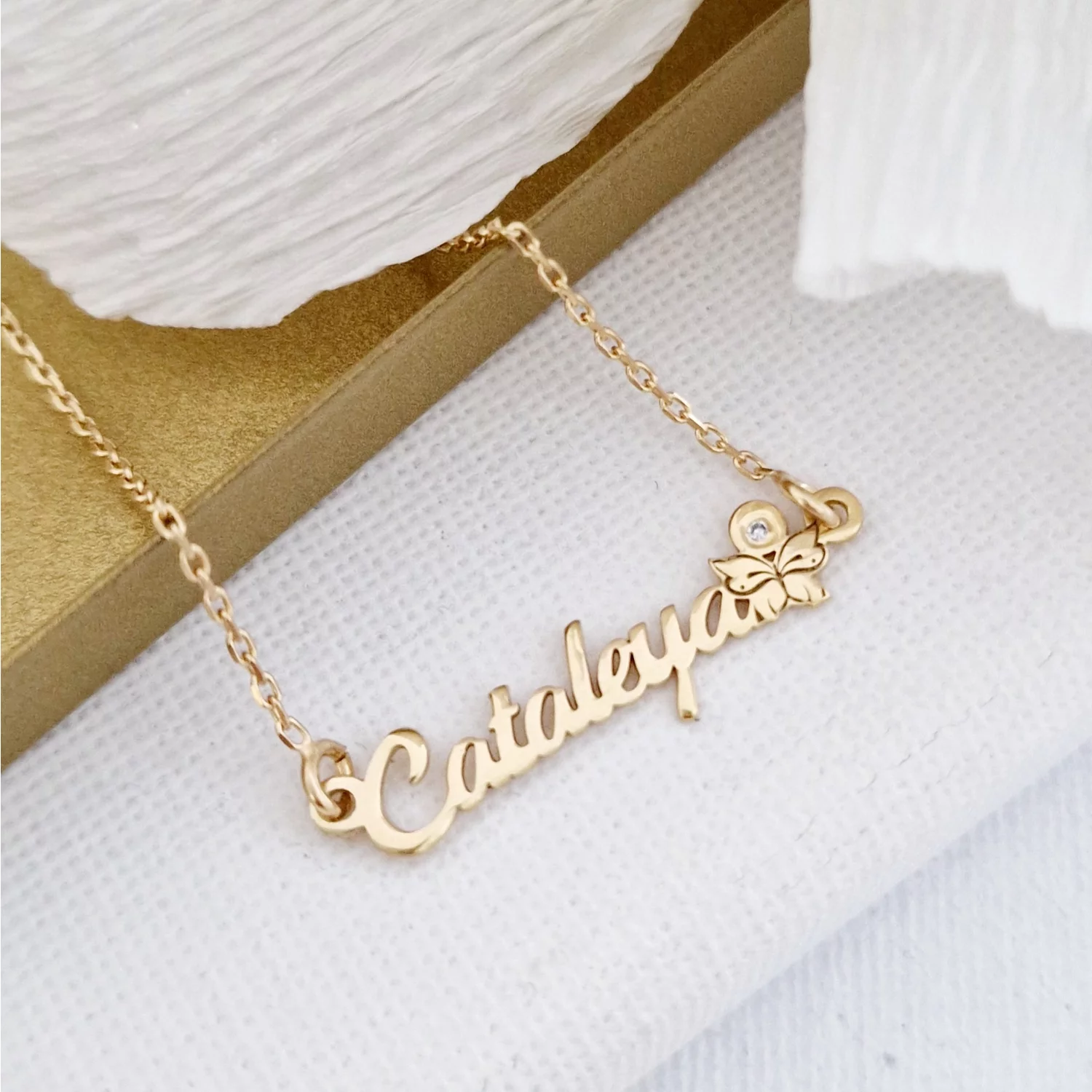 Lantisor personalizat cu Nume, simbol fluture si Diamant natural - Argint 925 placat cu Aur Galben 18K