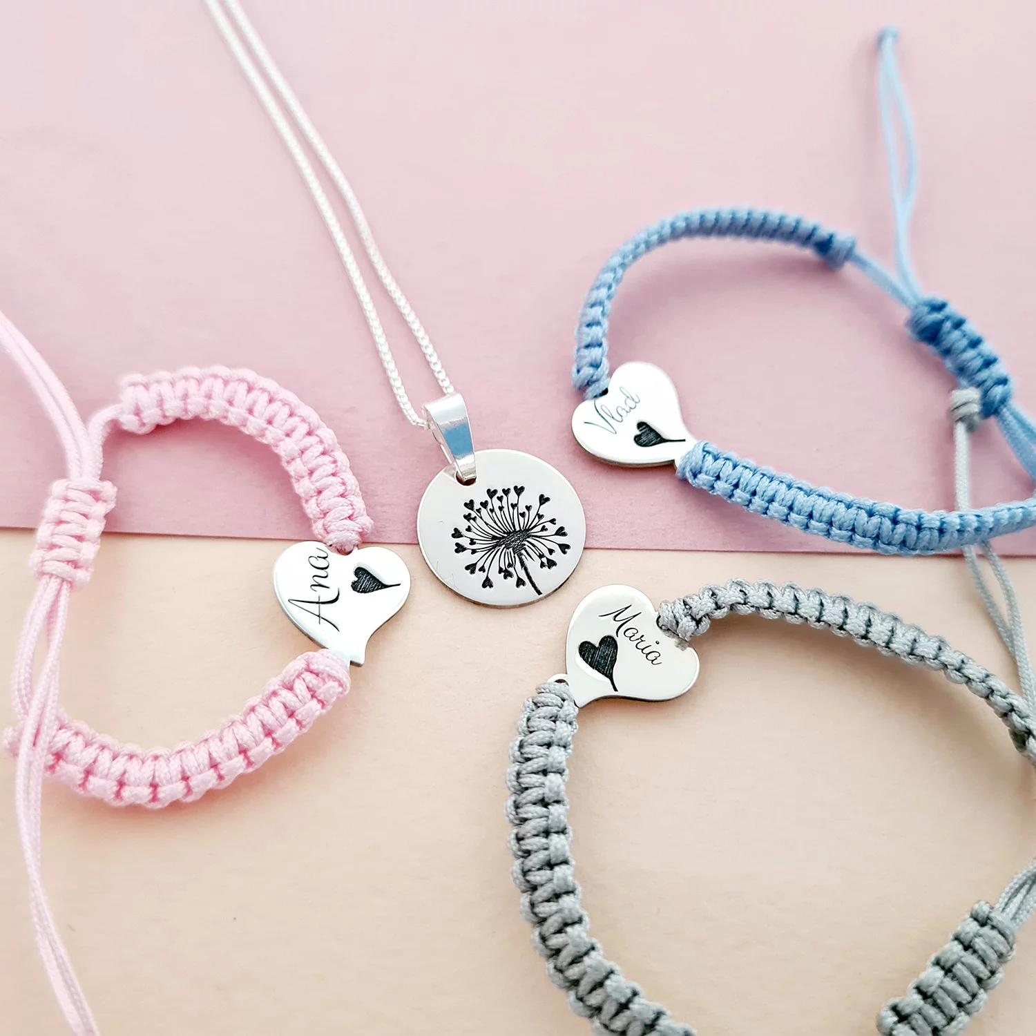 Set papadie - Lantisor cu pandantiv banut - 3 bratari inima personalizate cu nume - Bratari snur impletit - Argint 925