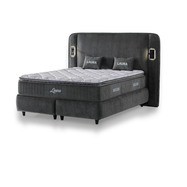 Pat tapițat cu Saltea Gratis, Laura 180x200 cm gri cu somieră rabatabilă, ladă depozitare