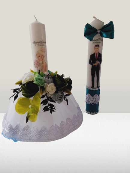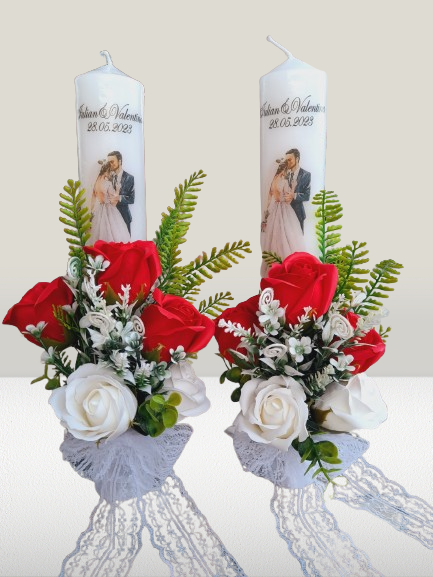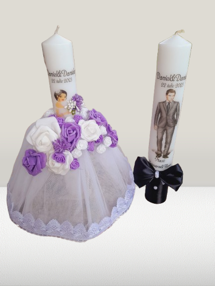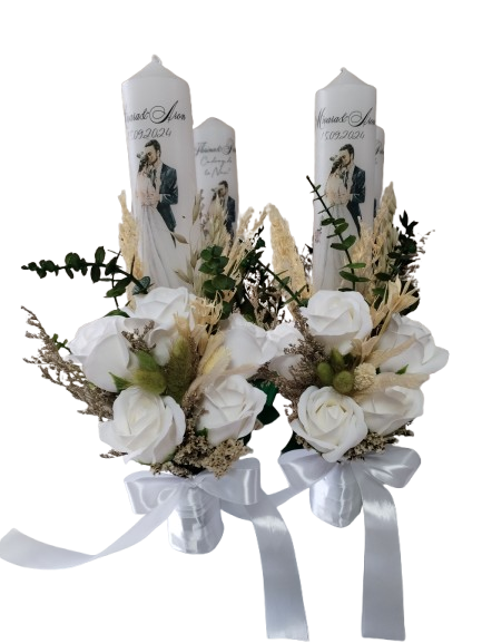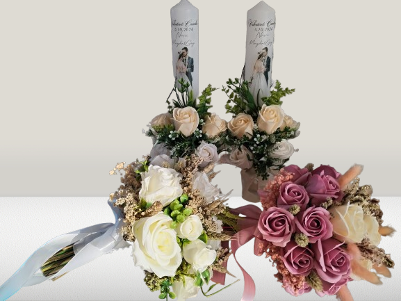 Set pentru nunta, lumânări personalizate și buchet pt mireasa și nașa ,engros