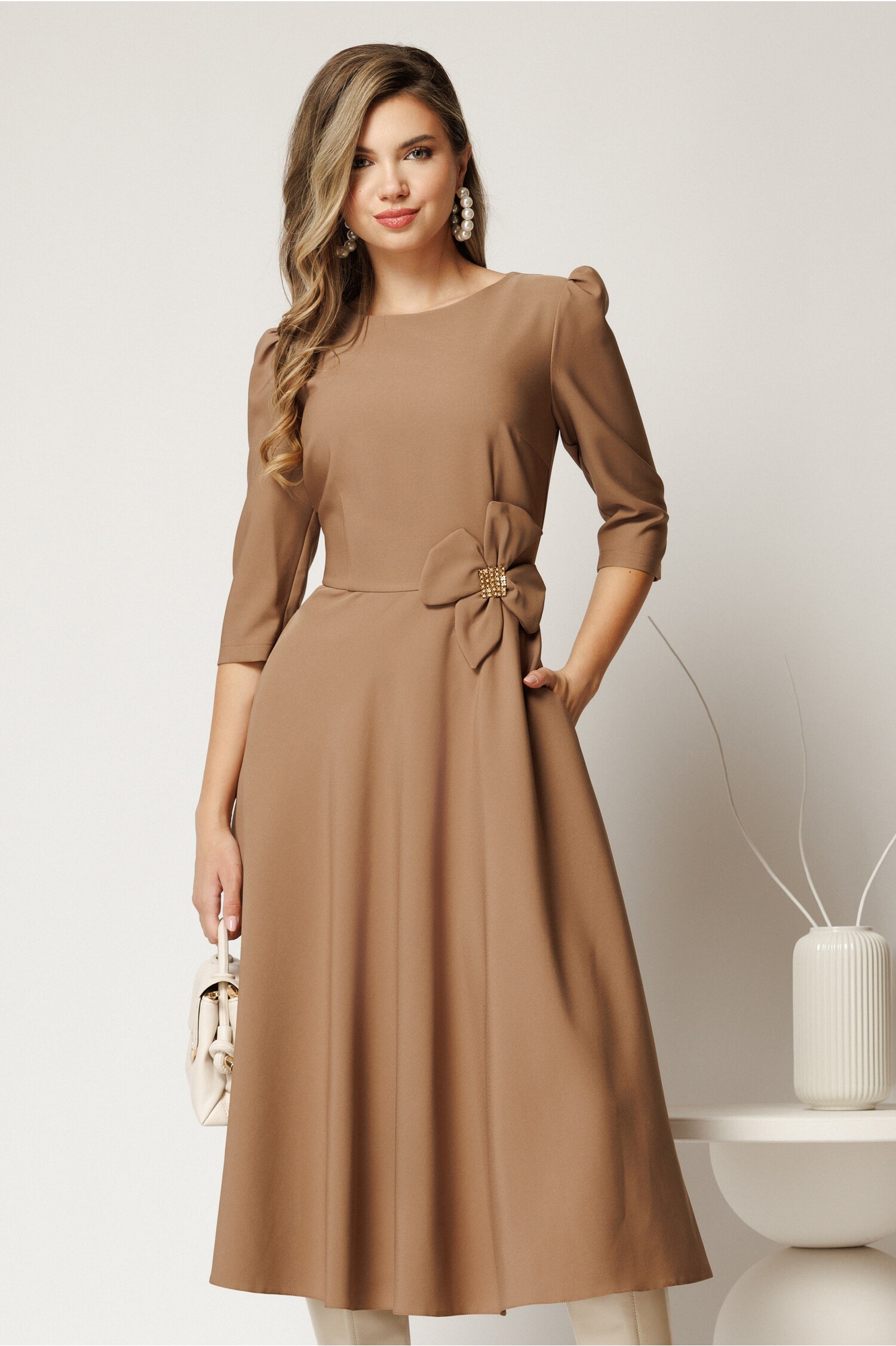 Rochie midi bej din stofa in clos cu floare in talie