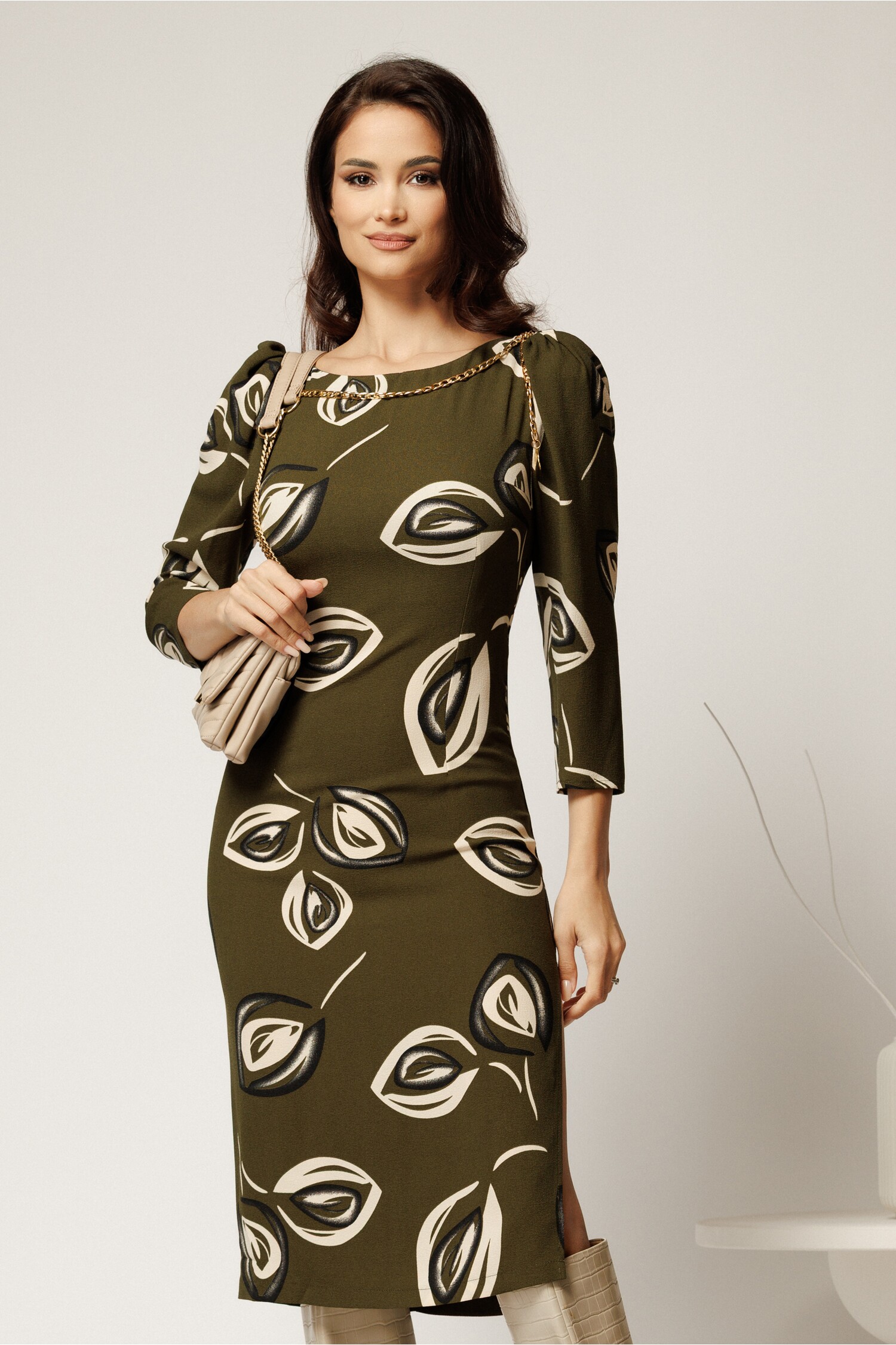 Rochie cu imprimeu si decolteu in V, Rosu/Verde feriga/Bej deschis