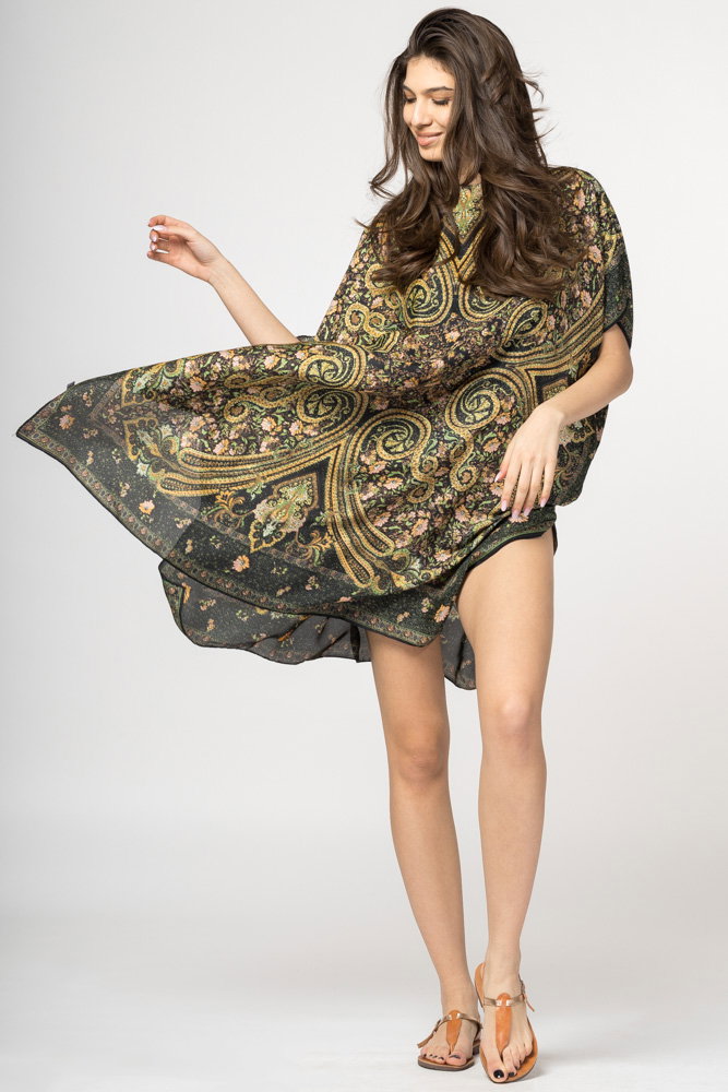 Rochie de plaja tip poncho din matase cu motive orientale pe fond negru Talie unica