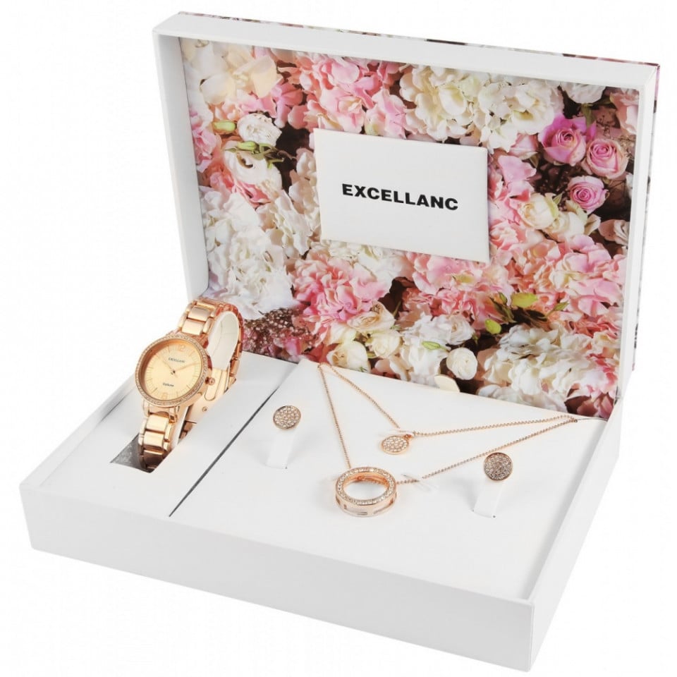 Set cadou, ceas dama, Excellanc, Gold Roze, Sublim Fit Utopia, colier dublu cu pandative si 1 pereche cercei dama Excellanc Engros