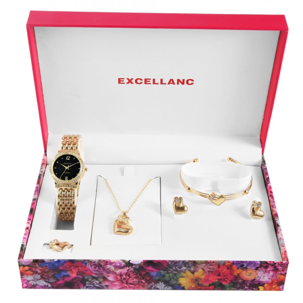 Set cadou, ceas dama, Excellanc, Auriu / negru, colier cu pandativ, 1 inel, 1 pereche cercei, bratara dama Excellanc, PM1800223-002 Engros