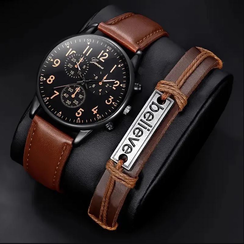 Pachet cu Ceas si Bratara, pentru Barbati, Model Believe Geneva, Set cadou, Leather look, Maro Engros