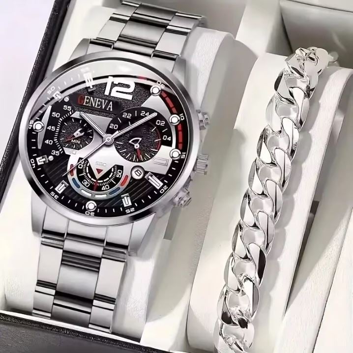 Set Cadou cu Ceas si Bratara, pentru Barbati, Model Business Geneva, Stainless-steel, Argintiu Engros