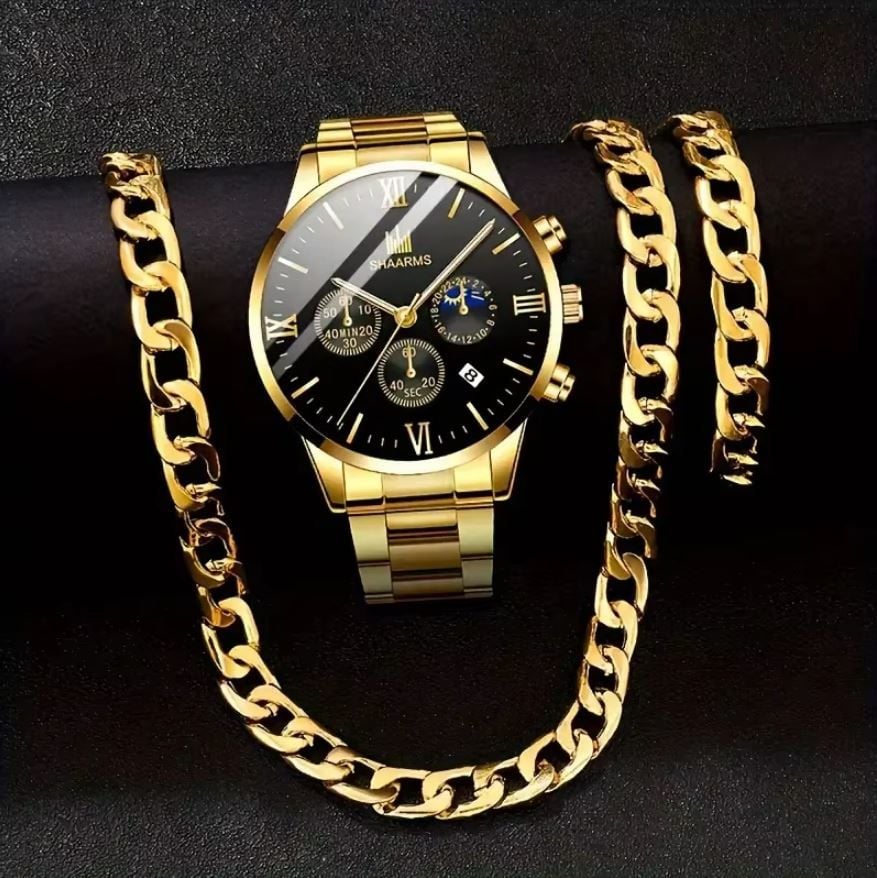 Set Cadou Shaarms, 3 Accesorii cu Model Cubanez, Ceas + Lant + Bratara, Metalic, Auriu Engros