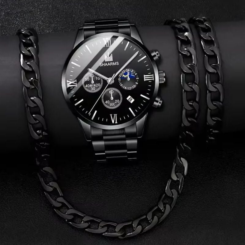 Set Cadou Shaarms, 3 Accesorii cu Model Cubanez, Ceas + Lant + Bratara, Metalic, Negru Engros
