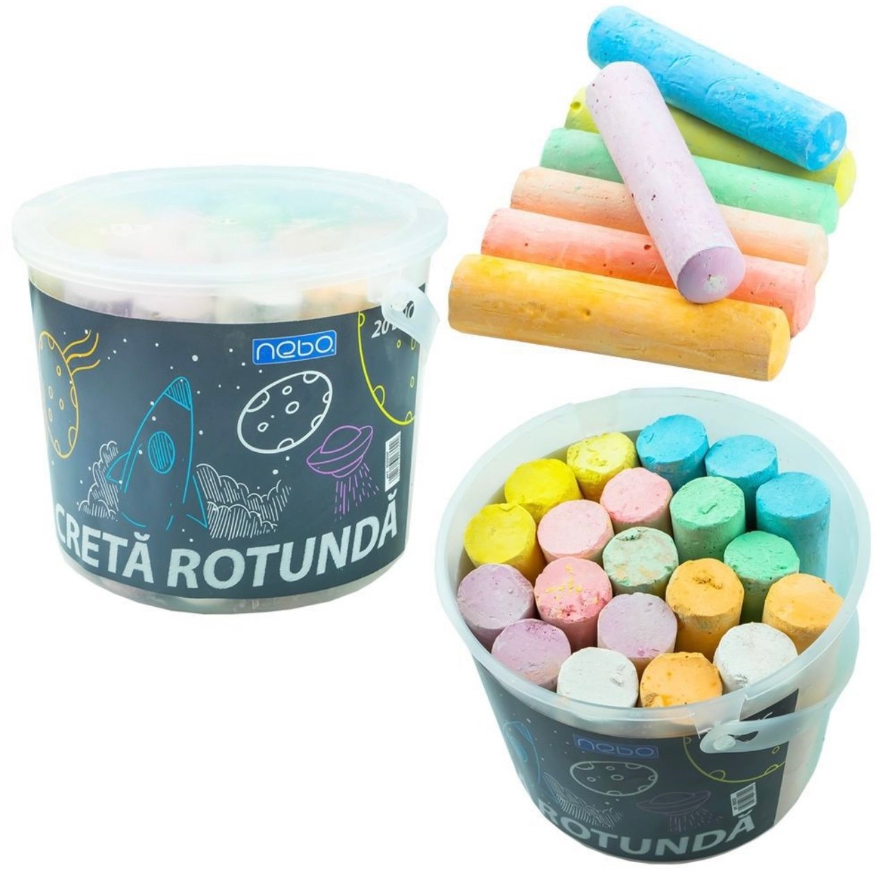 Set Creta Colorată Rotundă Nebo Engros – 20 Bucăți în Găletușă, pentru Desen pe Asfalt și Tablă | Culori Vii, Ideal pentru Copii și Școală
