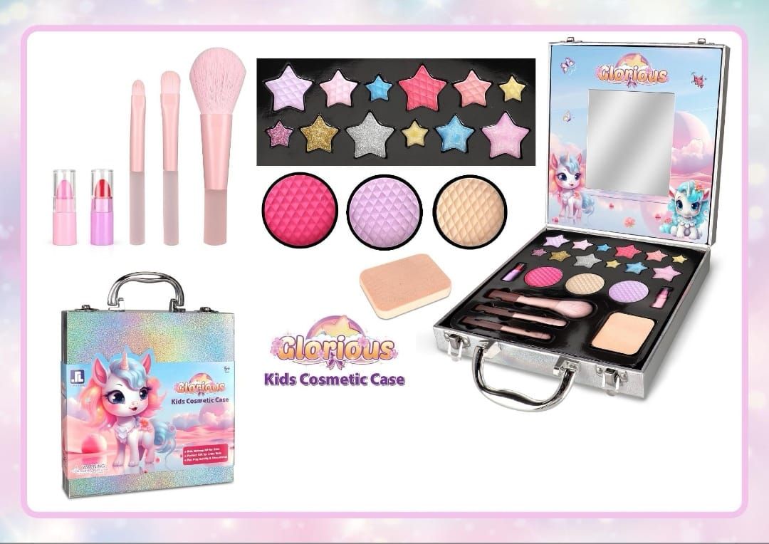Set Machiaj Copii Glorious Kids Cosmetic Case – Trusă Profesională în Valiză Metalică Cu Farduri, Pensule și Rujuri, Cosmetice Lavabile și Non-Toxice Pentru Fetițe 5+, En-gros