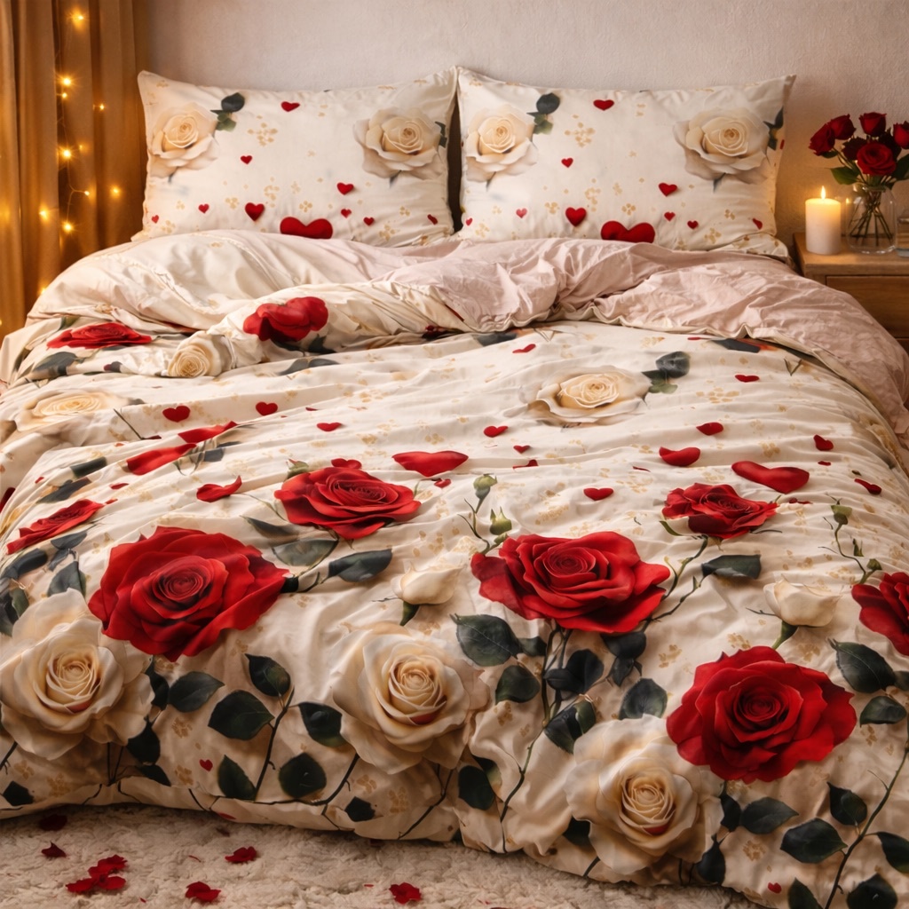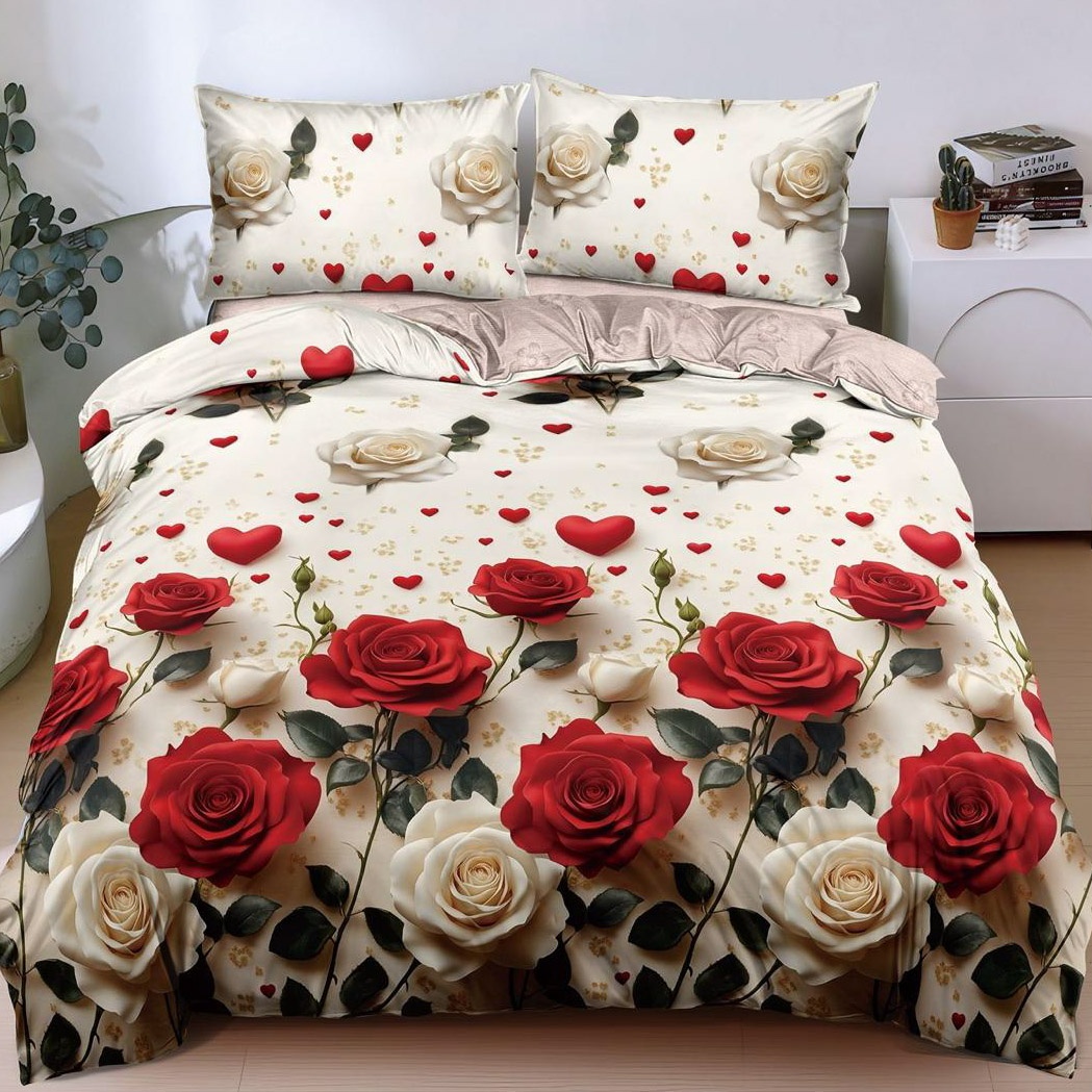 Lenjerie pat dublu, Finet, 6 piese, Alb, Roz, trandafiri