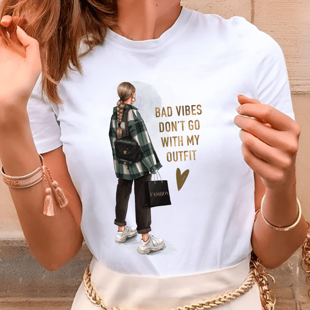 Tricou Casual Damă Engros Alb | Bad Vibes Dont Go With My Outfit | Bumbac Organic 100%, 160 g/m²