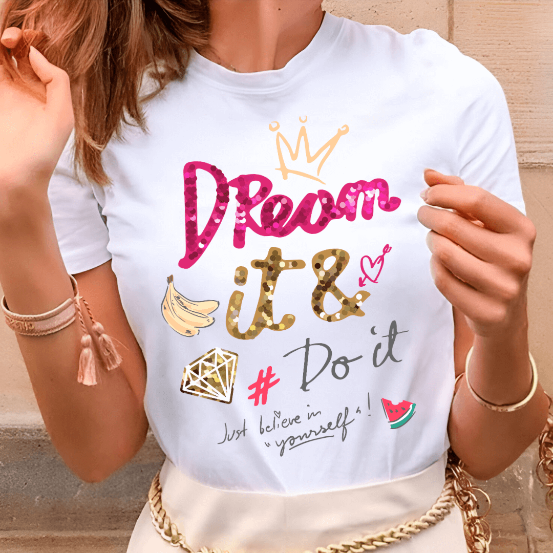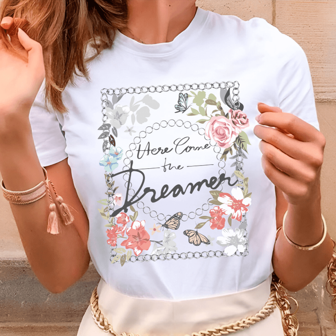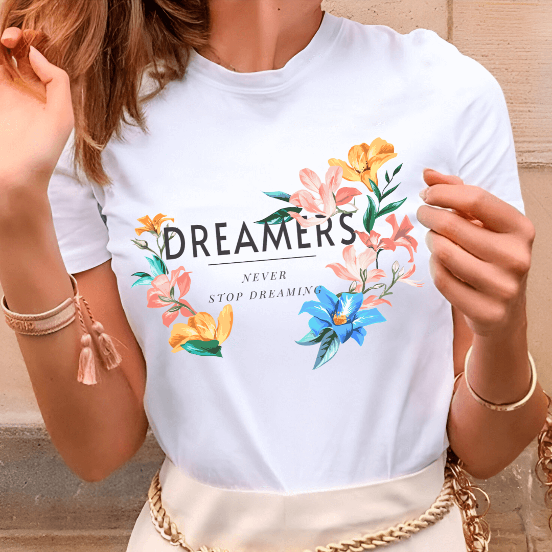 Tricou Casual Damă Engros Alb | Dreamers Never Stop Dreaming | Bumbac Organic 100%, 160 g/m²