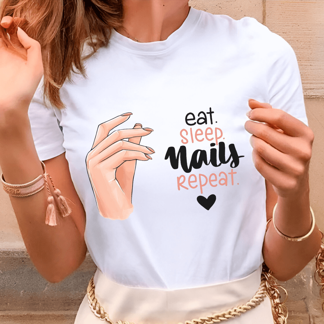 Tricou Casual Damă Engros Alb | Eat Sleep Nails Repeat | Bumbac Organic 100%, 160 g/m²