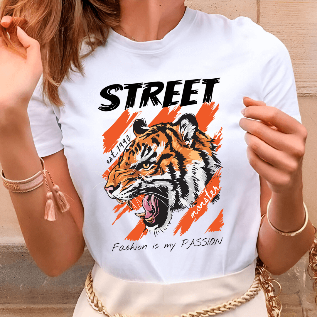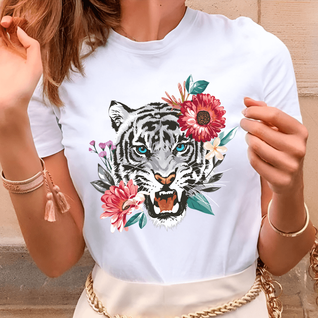 Tricou Casual Damă Engros Alb | Flowers Tiger | Bumbac Organic 100%, 160 g/m²