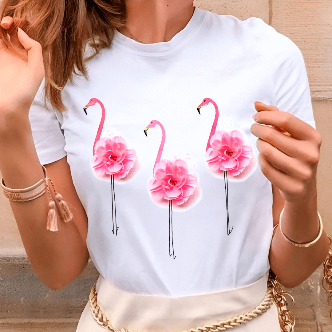 Tricou Casual Damă Engros Alb | Flamingo Flowers | Bumbac Organic 100%, 160 g/m²