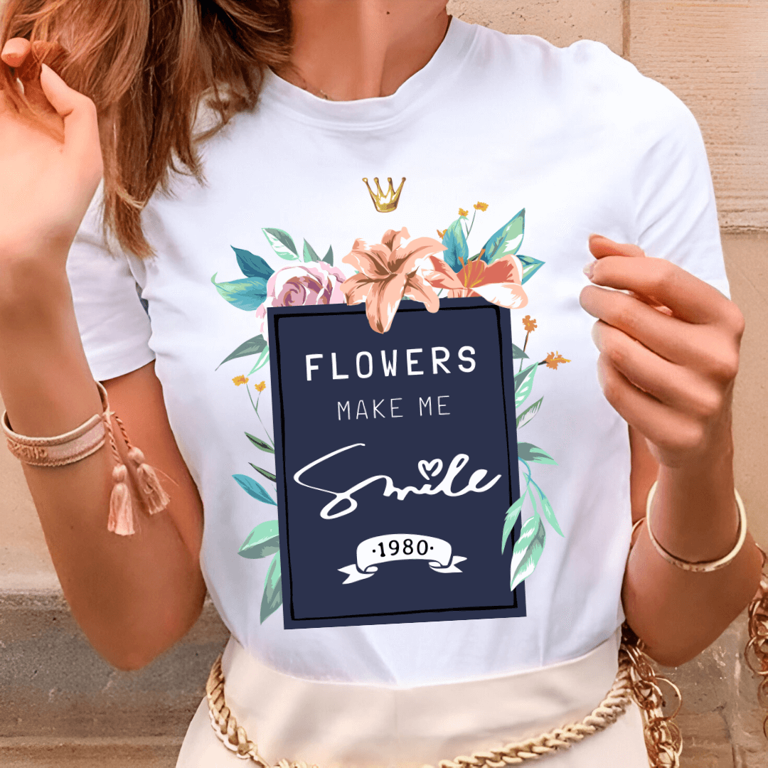 Tricou Casual Damă Engros Alb | Flowers Make Me Smile | Bumbac Organic 100%, 160 g/m²