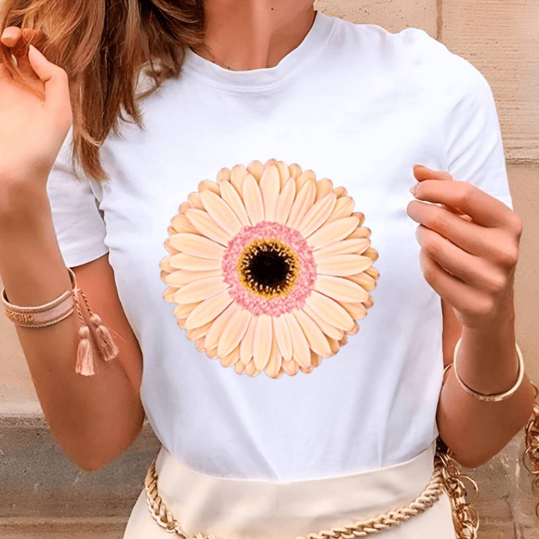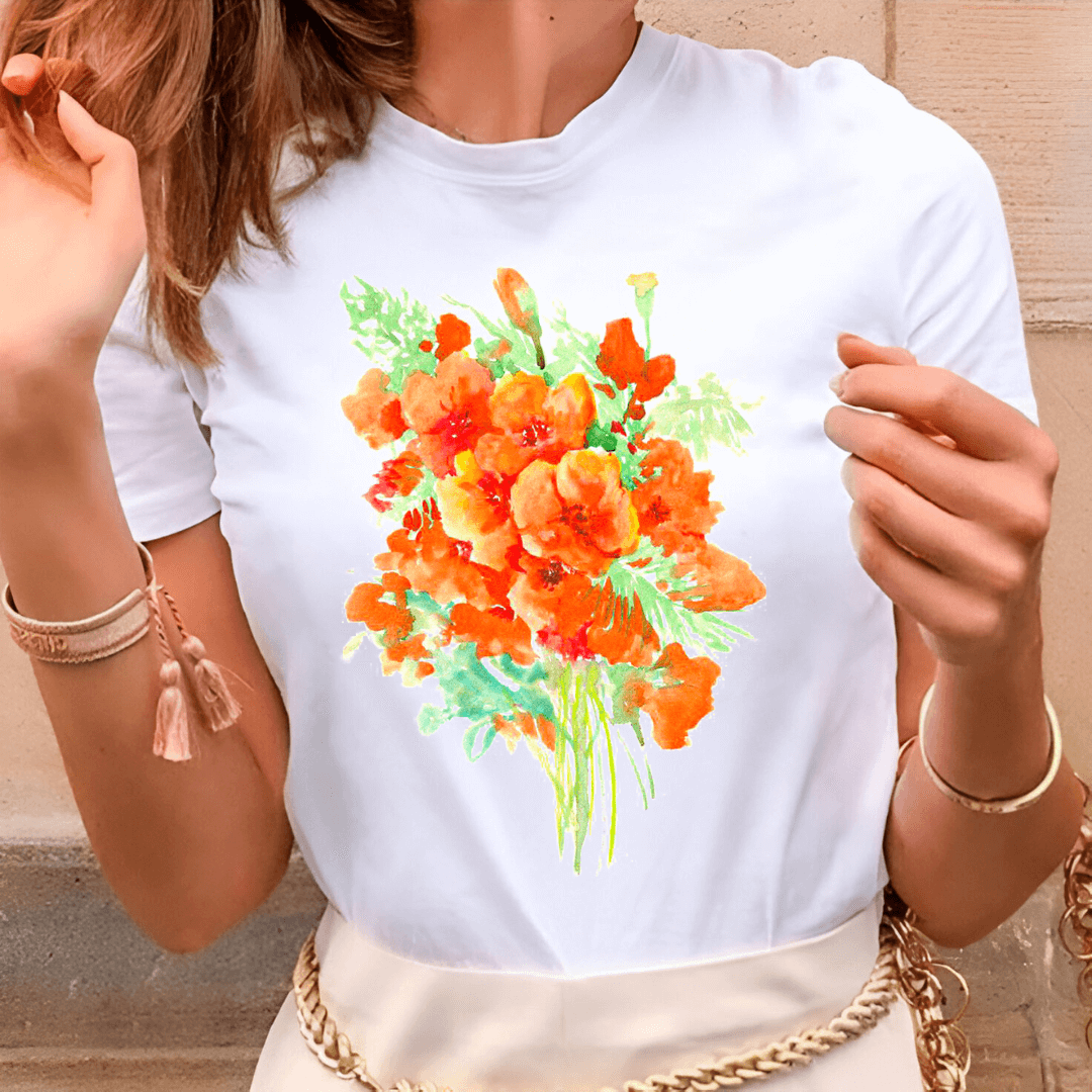 Tricou Casual Damă Engros Alb | Flowers Paint | Bumbac Organic 100%, 160 g/m²
