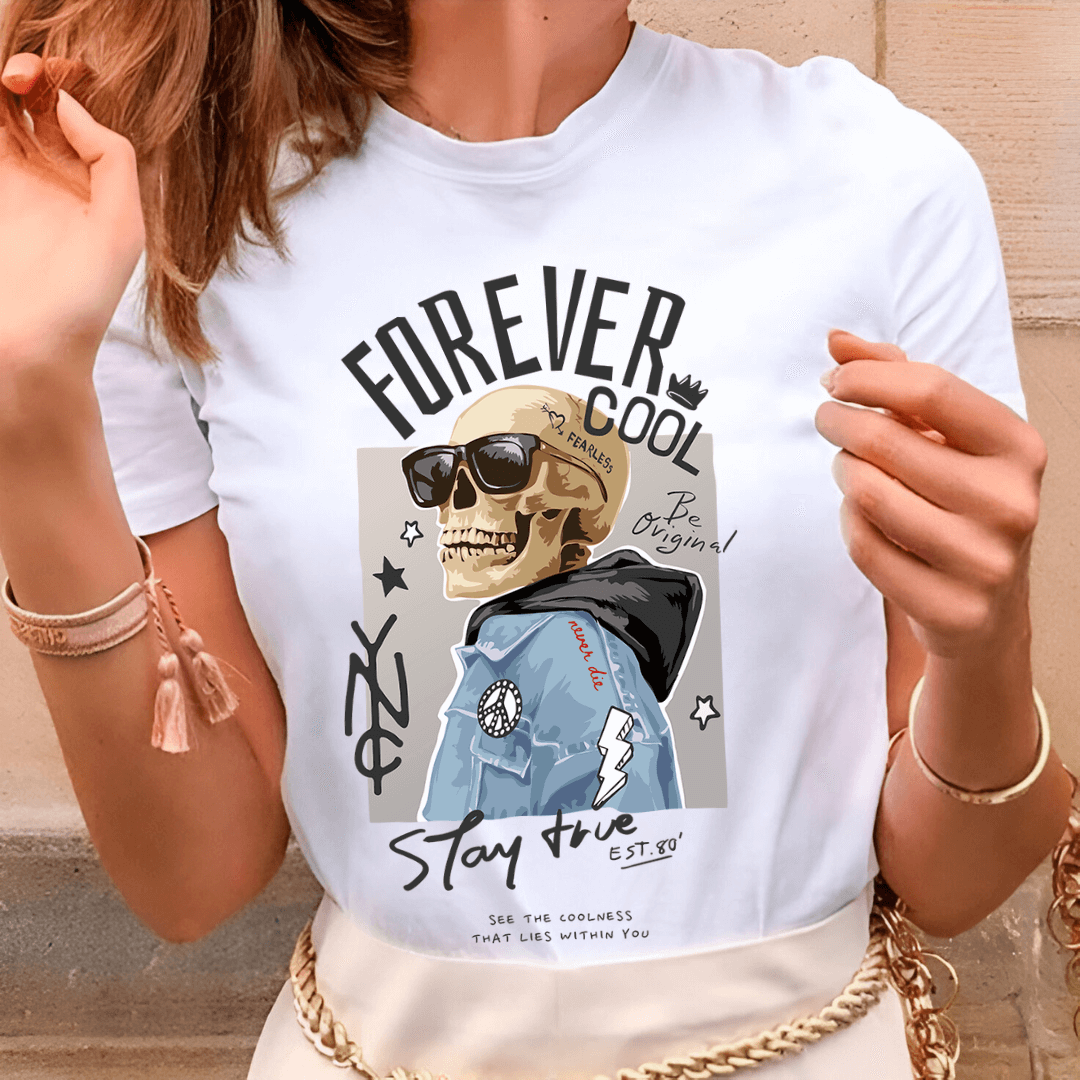 Tricou Casual Damă Engros Alb | Grey Skull | Bumbac Organic 100%, 160 g/m²