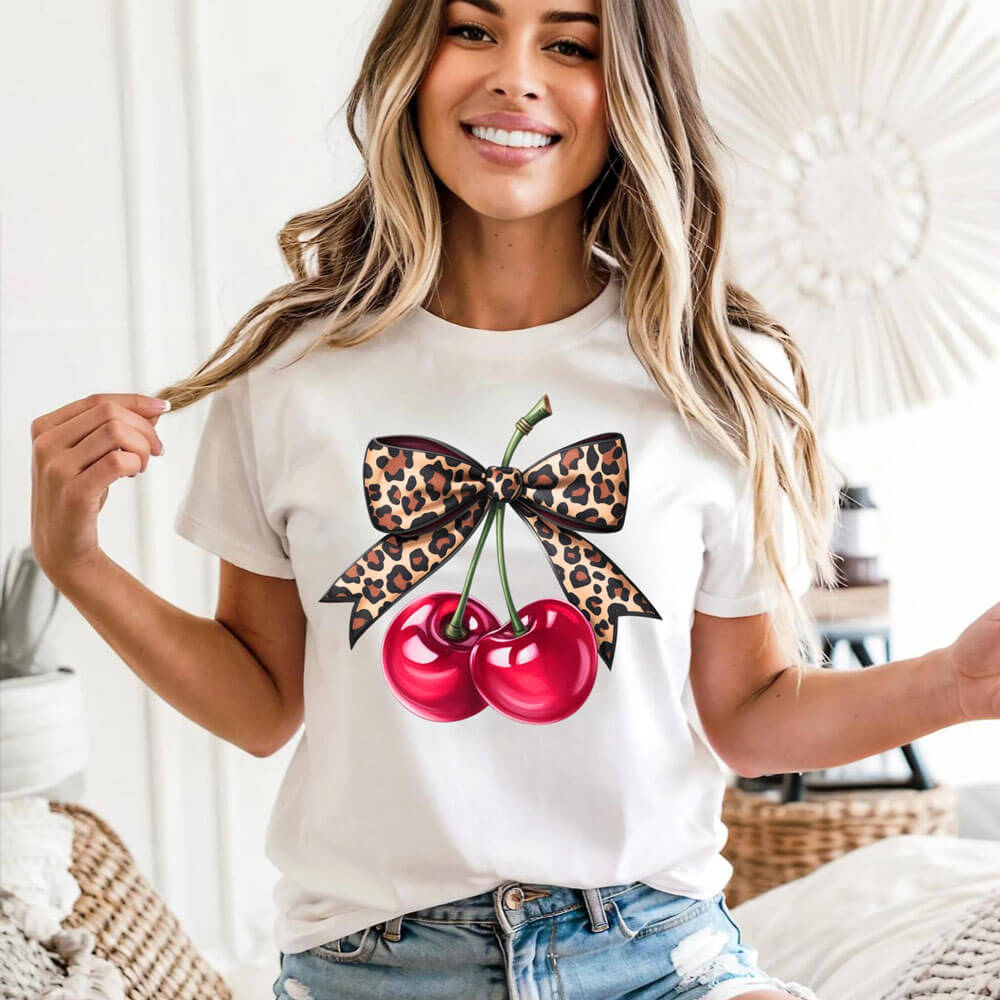Tricou Casual Damă Engros Alb | Cherry Coquette Leopard | Bumbac Organic 100%, 160 g/m²