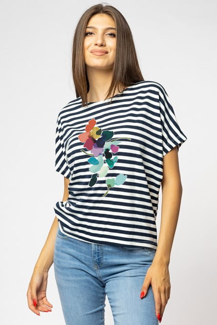 Tricou cu dungi alb - bleumarin si snur la poale, din bumbac S/M
